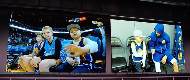 一位小男孩穿著庫里晚安的藍色T恤,起初庫里并沒有在意。